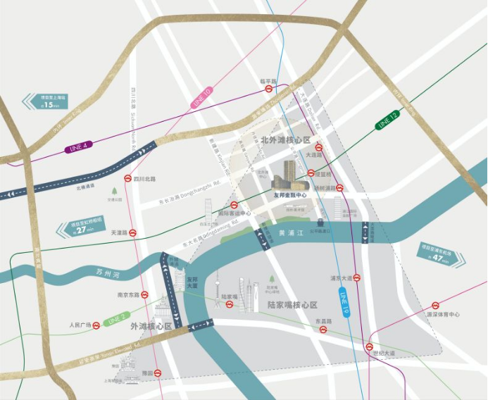 友邦金融中心总建筑面积约为22.5万平方米,本项目坐落于号称“世界会客厅”的上海“北外滩”核心板块,该板块与“外滩”、“陆家嘴”共称为“黄金三角”。优越的地理位置带来了便捷的交通,高效畅达全城: