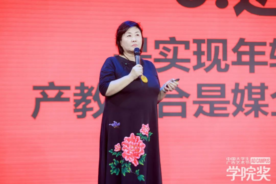 广告人文化集团总裁穆虹女士发表致辞演讲。她表示,广告人文化集团不断创新发展,聚合产业力量,打造广告业新生态,为校企搭建“鹊桥”,助力品牌强大,做品牌年轻化的引领者。关于大力探索产教融合新模式,穆虹女士提出看法:“先对接,再融合”。课程改革对接产业需求、对接专业岗位,从专业建设抓起,实现产教共赢。期待未来与企业、高校共同携手为中国广告事业的发展,为中国广告教育的发展作出贡献。