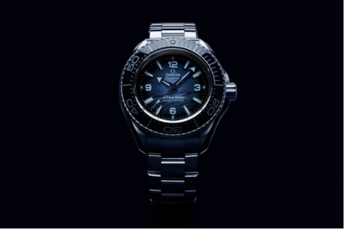 这次欧米茄海马75周年纪念款的表盘,虽然每一款的质感都不同,却都采用了渐变蓝色的晕染效果,欧米茄称之为“Summer Blue”。但是根据每个款式所能承载的下潜深度不同,表盘采用的蓝色色调也不同,基本上对应照光层,弱光层,深海层,深渊层的不同深度下海水呈现的效果。比如6000米已经到了海底的深渊层,这个深度是需要探照灯照明的,那海洋宇宙Ultra Deep 6000M专业潜水表表盘的蓝也就更加深邃,几乎接近黑色。
