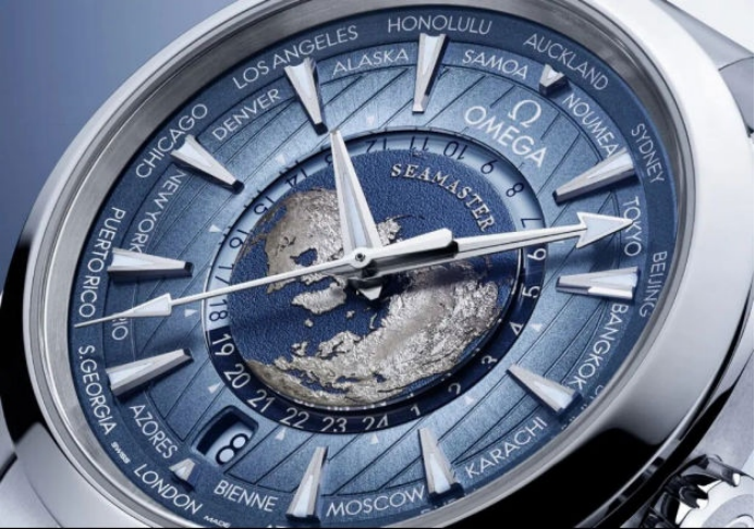 世界时是这一纪念系列中唯一的一款复杂功能腕表。前一阵子亮相的三枚Aqua Terra世界时统一采用了陶瓷表圈。但陶瓷表圈的设计并没有延续到本次世界时的纪念款。但这次的款式也有两种表带款式可供选择。虽然中间激光烧蚀工艺的海洋和陆地对表盘渐变效果有一点小小的影响,但整体的色调的确是和谐统一的。这里我有一个小小的设想,如果把各地时区的代表城市改成这个时区最著名的海岛,会不会更有意思?当然这可能对时区功能的使用造成很多麻烦。
