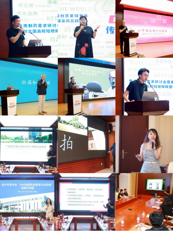 现场,湖北师范大学蒋达老师、山东工艺美术学院创新创业学院郑建鹏老师、河南工业大学高雅真老师、苏州大学刘英杰老师分别从高校美育改革与教学实践创新、广告设计核心技能培养、导师工作室教学培养、短视频制作指导攻略进行主题分享。来自珠海科技学院黄钲皓同学,围绕“追寻自我”主题分享自己短视频创作的历程。