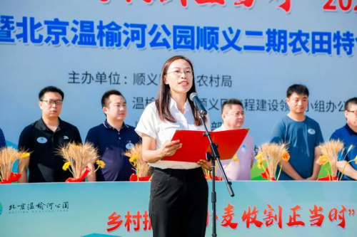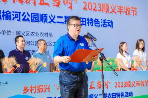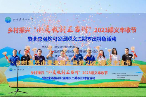 6月15日,“乡村振兴•小麦收割正当时”2023顺义区丰收节暨北京温榆河公园顺义二期农田特色活动在顺义区后沙峪镇的温榆河畔举办。