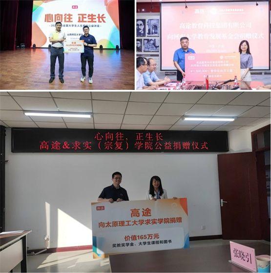 为帮助引导当代大学生树立正确的学习观和就业观,增强职业生涯规划意识,培养创新创业思维,保持奋发昂扬向上的精神状态。6月12日到15日,高途先后向山西师范大学、太原理工大学、河南大学、武汉理工大学四所大学捐赠了总价值超过600万元的课程书和书籍,支持在校大学生学习提升。同时高途在山西师范大学、太原理工大学设立了连续三年的“奖教奖学金”,用于奖励有突出贡献的教学项目和表现优异的在校大学生。