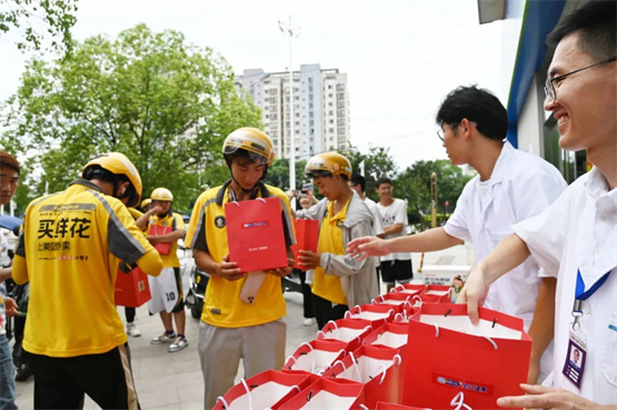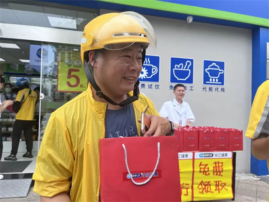 7月6日,全亿大药房为备受“烤”验的骑手们送上防暑大礼包。