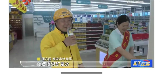 “最近天气太热了,广济医药给我们准备了水跟藿香正气液,内心非常感激。”一位前来领水的外卖员由衷地感谢道。