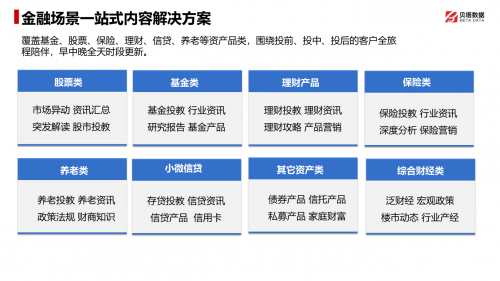 贝塔数据针对金融场景提供了一站式的内容解决方案,覆盖基金、股票、保险、理财、信贷、养老等不同资产类别,并以投前、投中、投后的全过程为核心,为金融机构提供全面的客户陪伴服务。