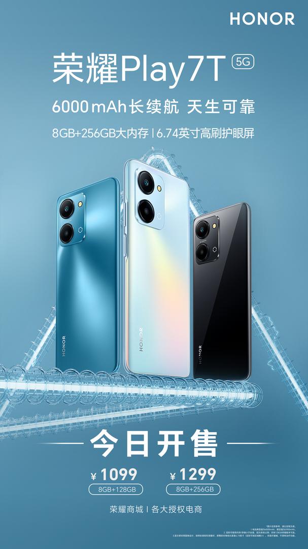 4月4日10:08,荣耀Play7T系列5G新品正式开售,8GB RAM+128GB ROM版售价1099元,8GB RAM+256GB ROM版售价1299元,在荣耀商城、荣耀京东自营旗舰店、荣耀天猫官方旗舰店等多渠道均可购买,还可限时获赠AM115耳机。对于购机预算在千元左右、或者想给爸妈长辈购买一款实用型手机的消费者,荣耀Play7T系列5G不失为一个绝佳的选择。
