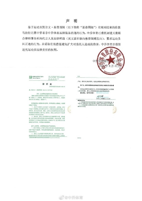 4月23日,伦敦马拉松瞩目开跑,中乔体育品牌代言人Kelvin Kiptum (凯尔文·基普图姆)作为行业顶级超新星以及中国品牌代言人自然备受关注。最终Kelvin Kiptum (凯尔文·基普图姆)在比赛中发挥出色斩获冠军,再度刷新个人PB并获得马拉松赛事领域历史第二名的佳绩;但同时,他却并未按照代言合约穿着赛场装备。这一违约行为引发重大争议,同时也使得中乔体育的品牌利益受到重大损害。