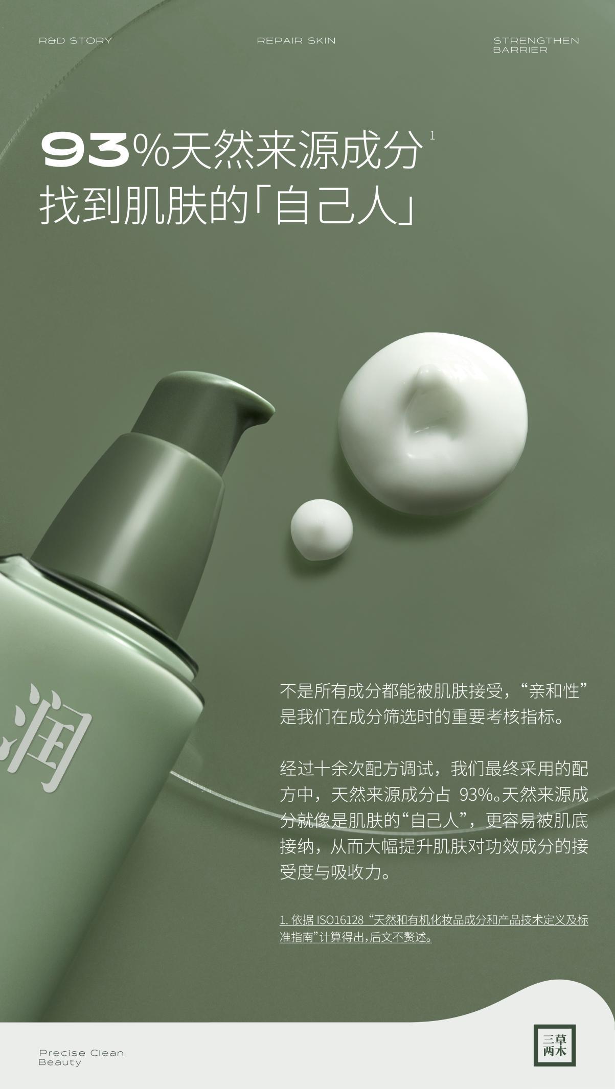 分肤定制专属方案的搭建同样离不开活性成分的精准筛选。为了帮助消费者深度润泽肌肤,三草两木选取崖壁上的润活精粹——铁皮石斛提取物,用自然之力降噪保湿,令肌肤水润、嫩滑、透亮;4D透明质酸钠+PENTAVITIN®锁水磁石的强力组合能够有效锁住游离水,帮助调控皮肤的含水量,进一步滋润、光滑、细腻皮肤。更让人惊喜的是,在三草两木经由十余次调试敲定的最终配方中,93%的成分都是天然来源,而且不添加任何对皮肤有风险的成分,敏感肌肤使用也完全没有负担。