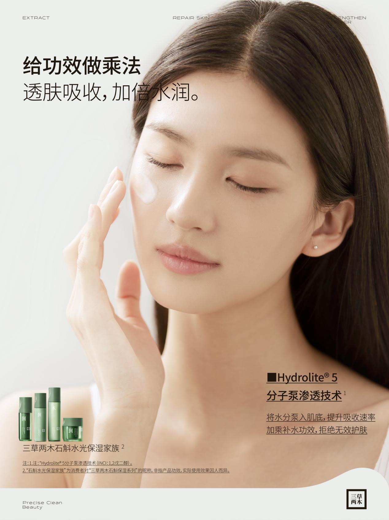 此外,三草两木石斛系列还创造性地使用了Hydrolite® 5分子泵渗透技术,在肌肤皮层中建立一座“输水分子泵”,使得功效成分穿过肌肤皮层,直接泵入真皮层,大大地提升了功效成分的生物利用度,将水分切实输送至肌底,摆脱外层湿润、内层干燥的“假润”困局,帮助肌肤实现由内而外的莹润水亮。