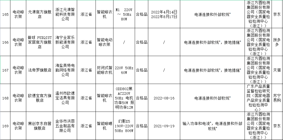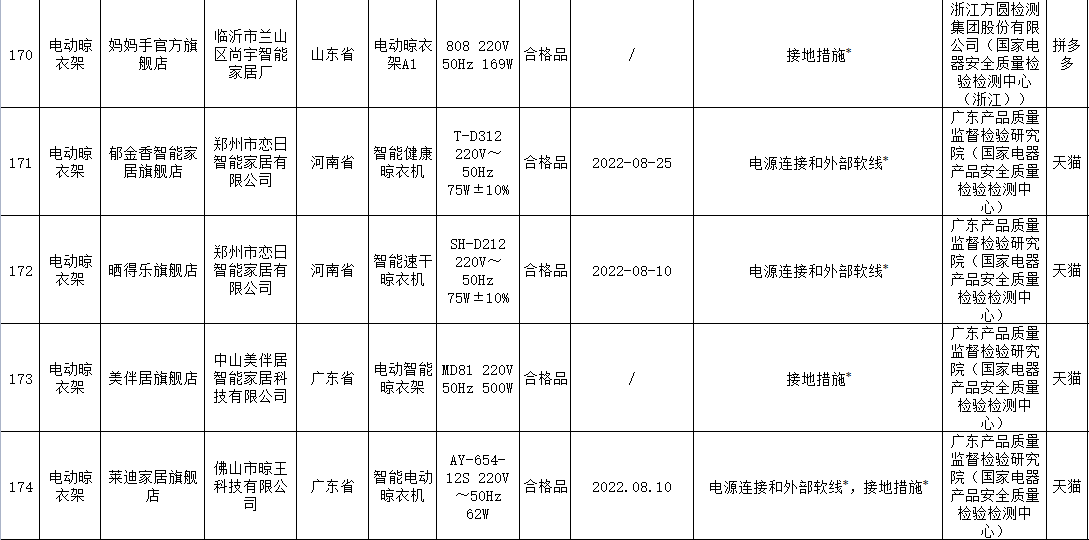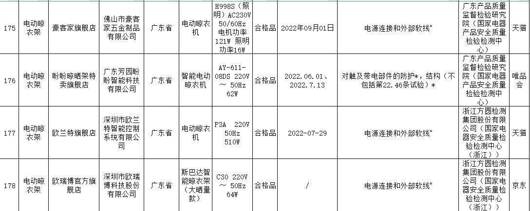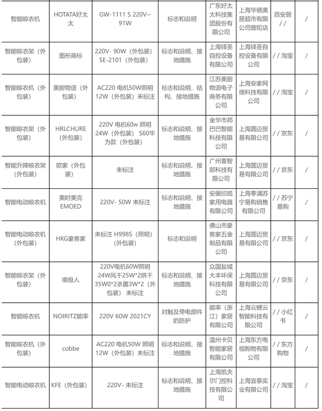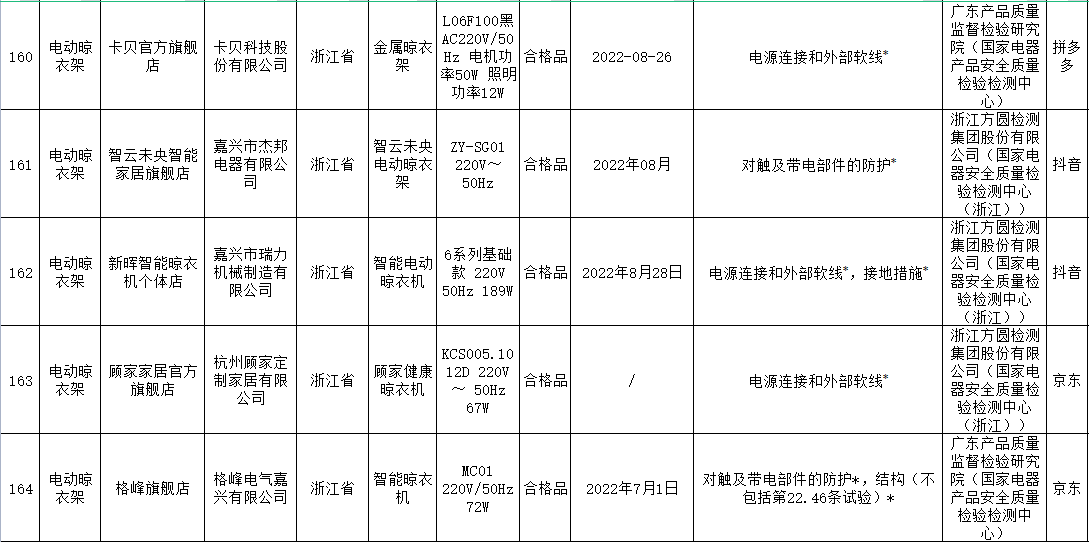 本次电动晾衣架抽查检验9个省(市)48家企业生产的52批次产品,包括天猫、京东、拼多多、抖音等电子商务平台,发现24批次产品不合格,涉及卡瑞琪(courage)、顾家、格峰、盼盼、欧兰特等品牌。