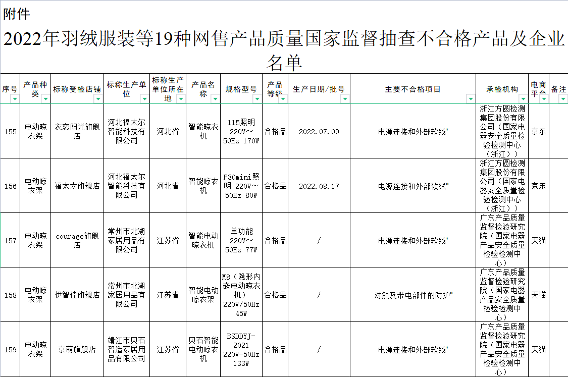 近日,市场监管总局通报了2022年羽绒服、电动晾衣架等19种网售产品质量国家监督抽查情况。结果显示,2022年度电动晾衣架抽查不合格率高达46.2%,为19种抽查产品中最高。