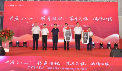 7月28日,北京汽车制造厂在青岛总部基地隆重举行“共庆‘八一’,躬身铭记,不忘关怀,倾情回报”捐赠退伍军人服务保障用车交付仪式,以实际行动做出拥军表率,为建军96周年献礼。原空军指挥学院副院长朱和平少将、中国退役军人就业创业服务促进会理事长王义少将、中国退役军人就业创业服务促进会常务副理事长林岗少将、中国汽车工业协会常务副会长兼秘书长付炳锋、山东省退役军人事务厅副厅长刘兴磊以及各界领导嘉宾共计200余人出席了本次仪式,北京汽车制造厂董事长陆付军在现场递交了此次捐赠的BAW卡路里皮卡新车钥匙。