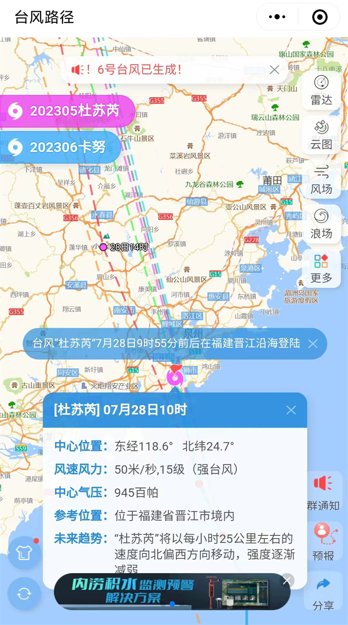 超强台风“杜苏芮”于2023年7月21日上午在西北太平洋洋面生成,于7月25日被中央气象台升至17级以上(62米/秒);于7月28日9时55分前后以强台风级(50米/秒)在福建省晋江市沿海登陆,成为有完整记录以来登陆福建泉州的最强台风,并已对福建泉州、晋江等城市造成严重影响。