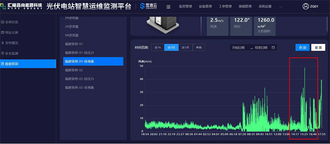 在整个台风过程中,汇耀品尚能源科技光伏电站智慧运维监测平台起到了重要作用,对环境风速变化、系统监测状态,及时提供了实时数据。