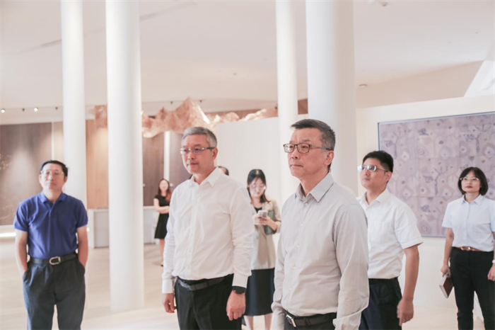 陈彦峰一行参观书香门地集团企业文化展厅、CNAS认可实验室、美学生活馆,了解书香门地集团发展历程、匠心制造、研发专利、品牌建设和质量提升等相关情况,零距离接触美学地板,感受“中国智造”与“美学设计”的独特魅力。美学生活馆艺术长廊内,施华洛世奇水晶、彩贝、玉石、花草等元素美学地板得到来访一行领导的高度评价,称赞书香门地美学地板颠覆人们对地板的传统认知,是新业态跨界融合的典范。